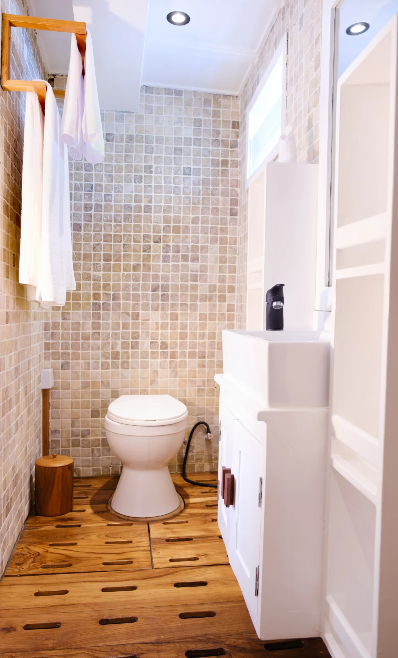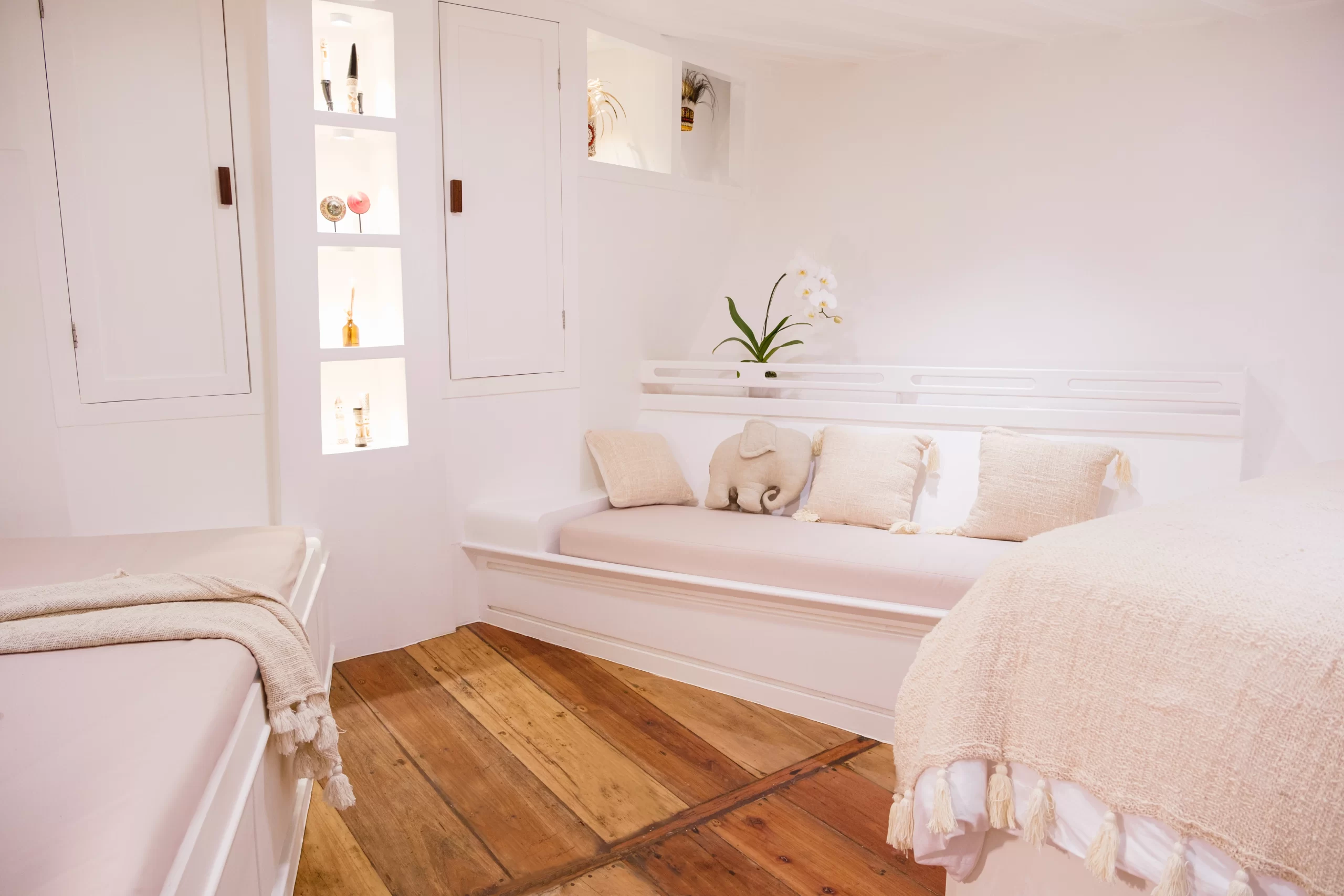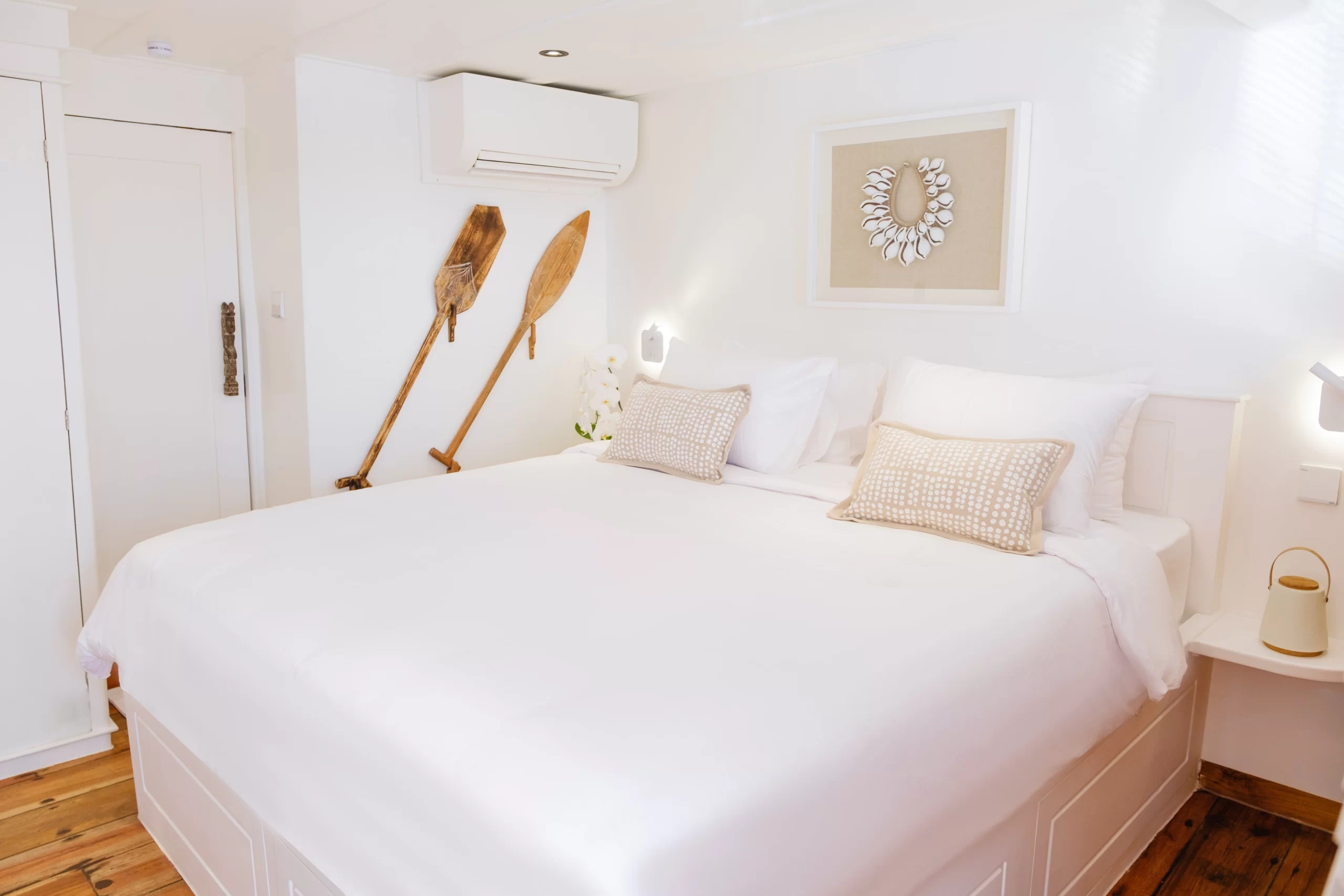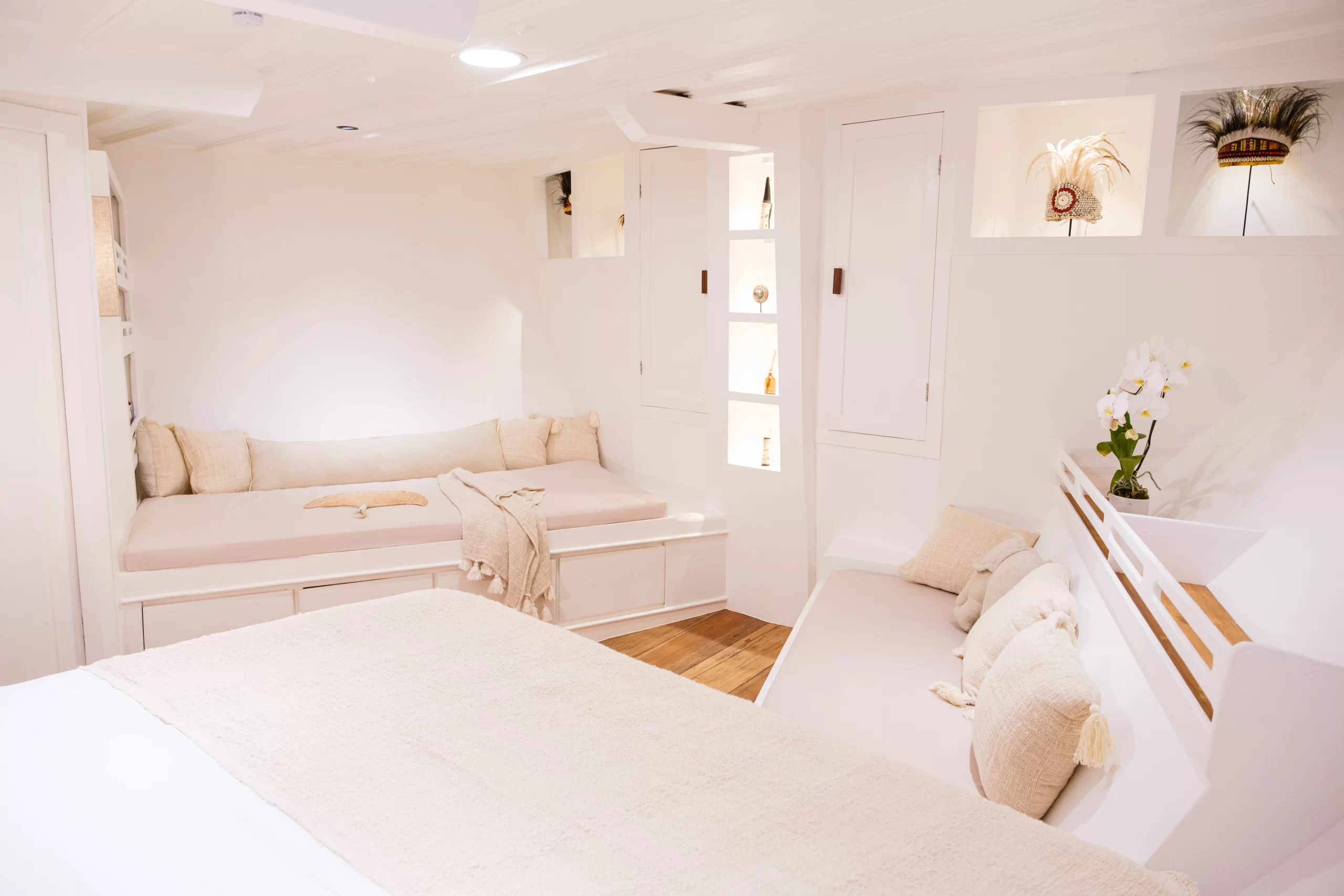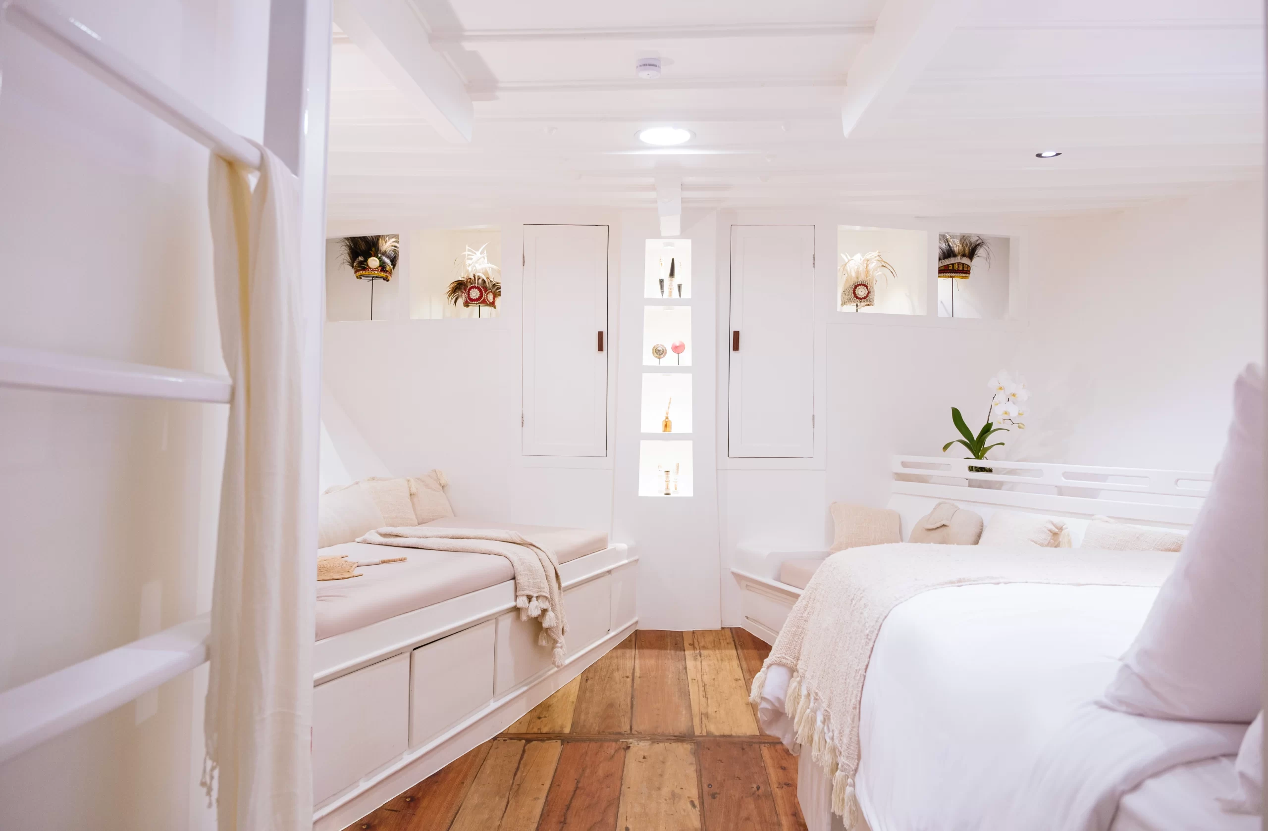 Seven cabins spread across three levels offer elegant comfort and surprising space, all outfitted with ensuite bathrooms, air-conditioning, and curated touches of Indonesian artistry.