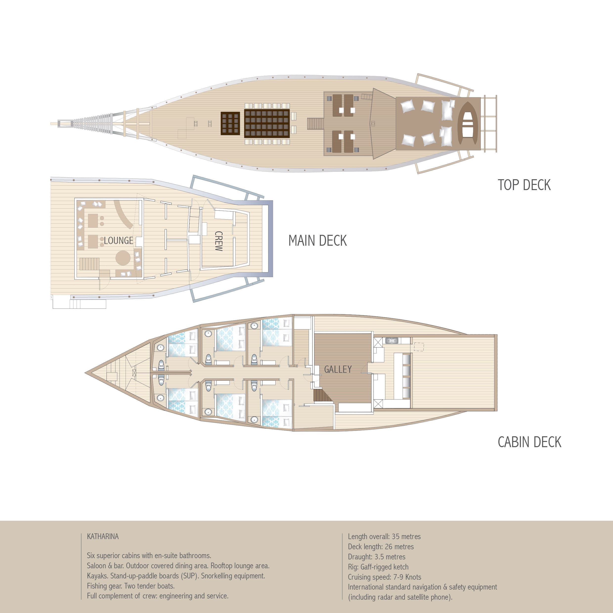 With space for up to 12 guests across six charming cabins, Katharina is tailored for families, small groups, or couples who don’t need 50 meters to feel like they’ve got the ocean to themselves. Every cabin is air-conditioned and designed with classic teak detailing and practical comfort in mind.