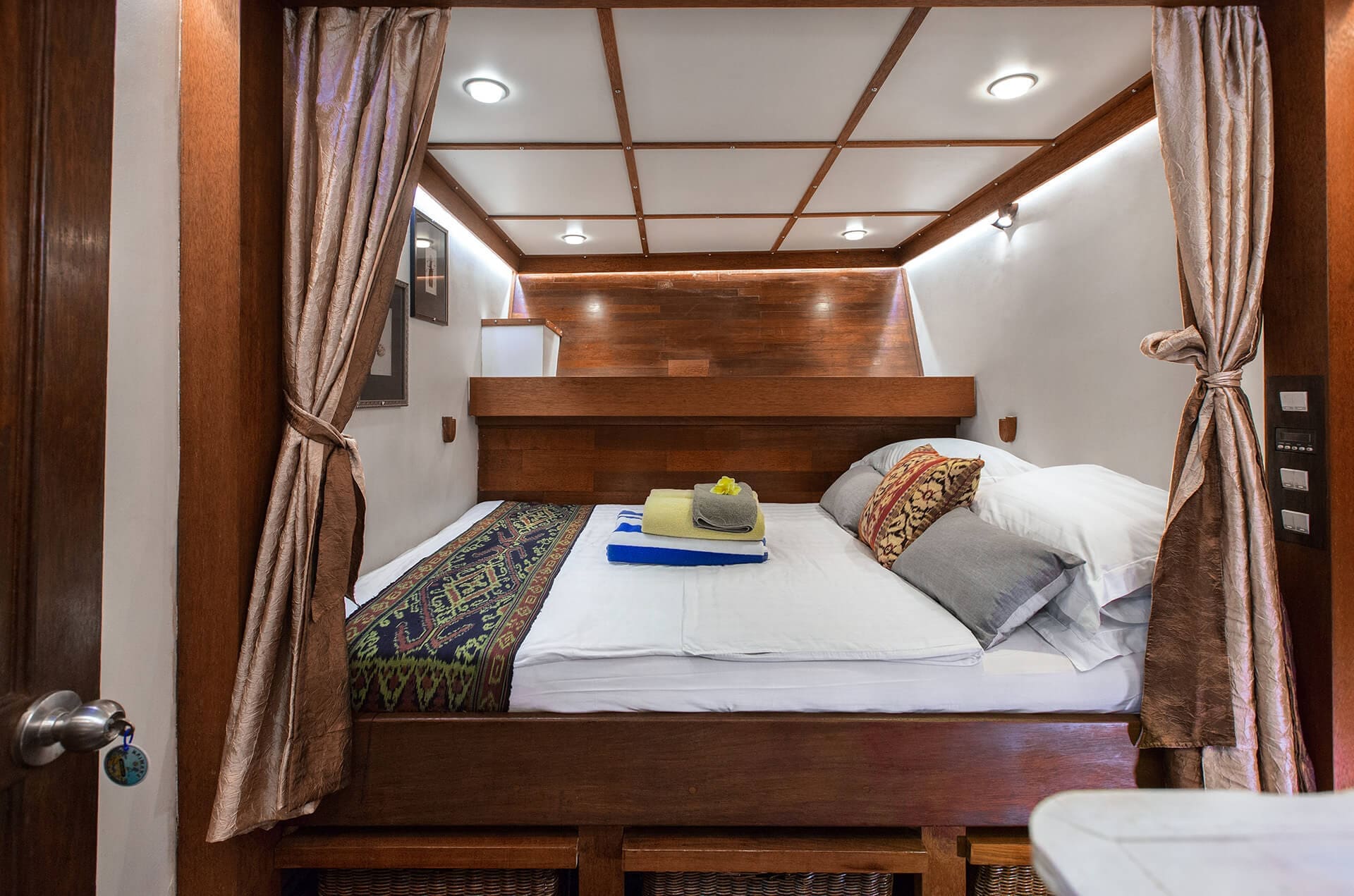 Katharina was built by the famed Bugis craftsmen of Kalimantan, using traditional methods passed down through generations, planking first, beams later, guided only by instinct and experience. A French naval architect redesigned her interior, merging old-world craftsmanship with Western comfort. The result is an elegant gaff-rigged ketch that feels equal parts vintage sailing vessel and modern boutique hotel.
